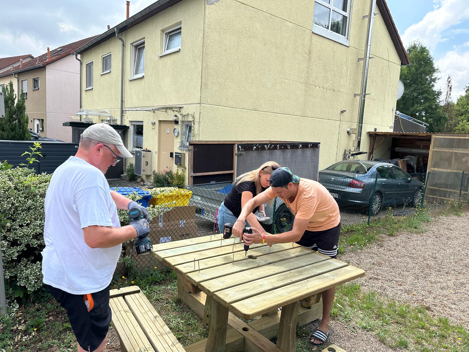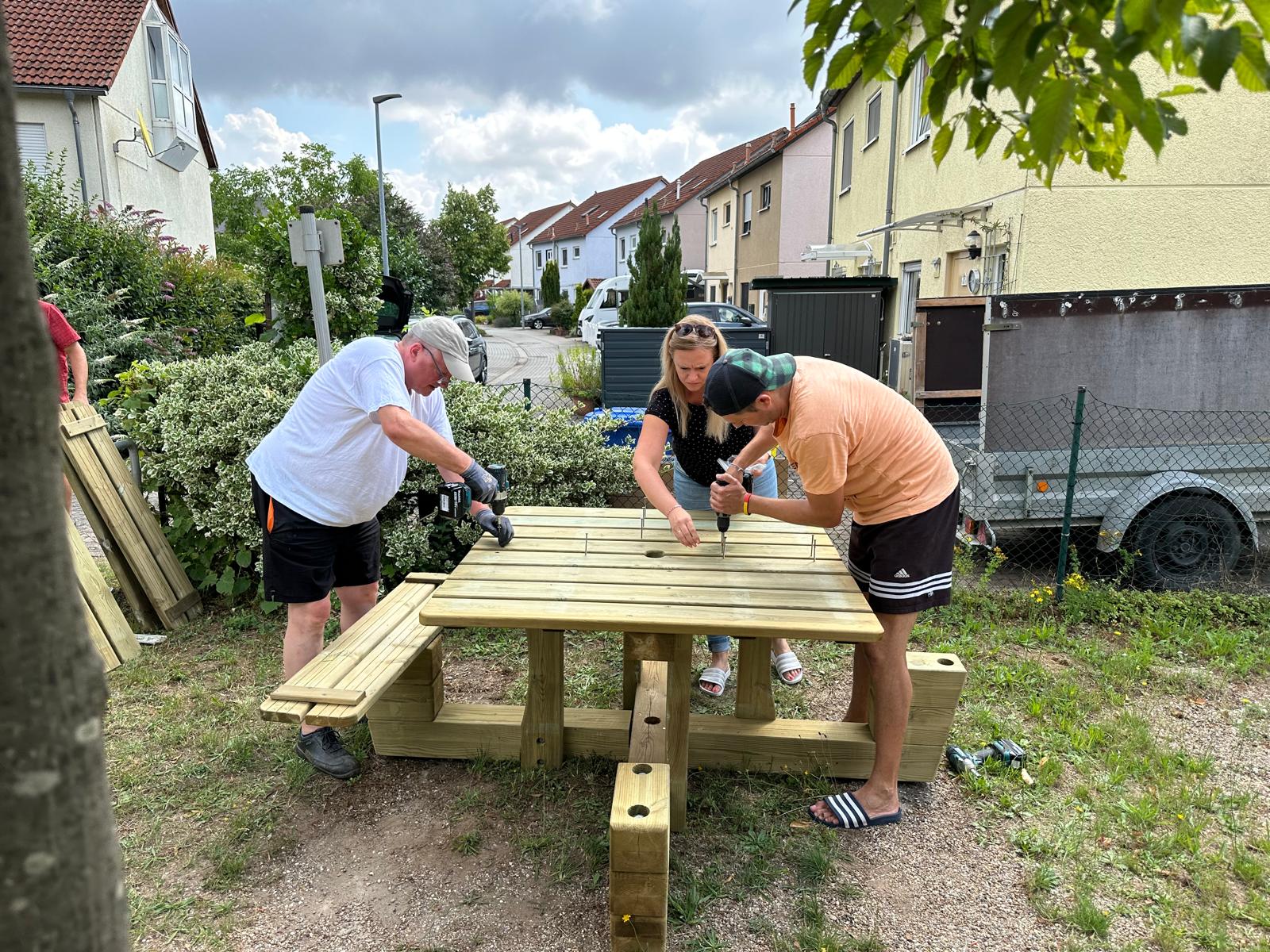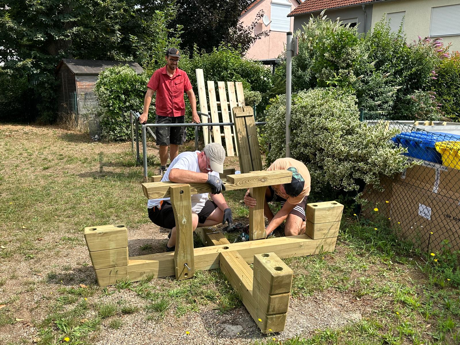 Gestern haben wir die Sitzgruppe dann aufgebaut. Vor allem Alex - mit der ganzen Familie - und Reiner haben montiert, andere Freiwillige waren mit Handreichungen dabei.
